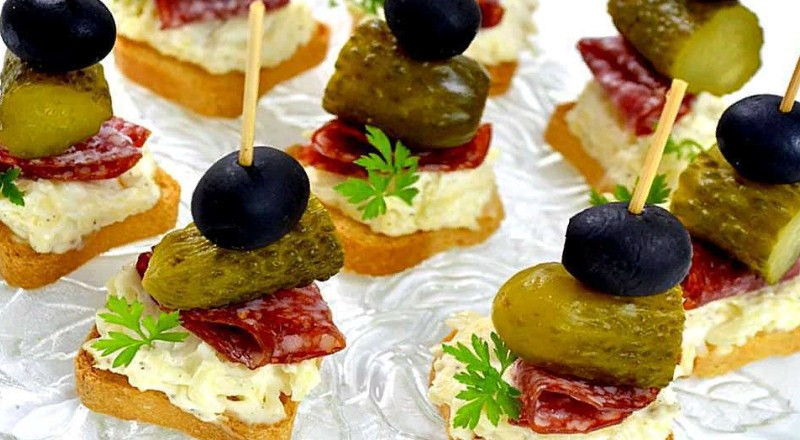 Есть канапе с соленым огурцом. Дополняем композицию маслиной, ломтиком салями и плавленным сыром. Такой шедевр отлично подойдет в качестве закуски к горячительным напиткам.