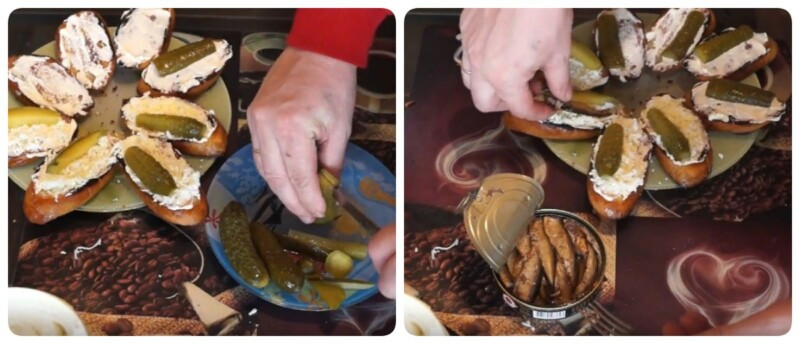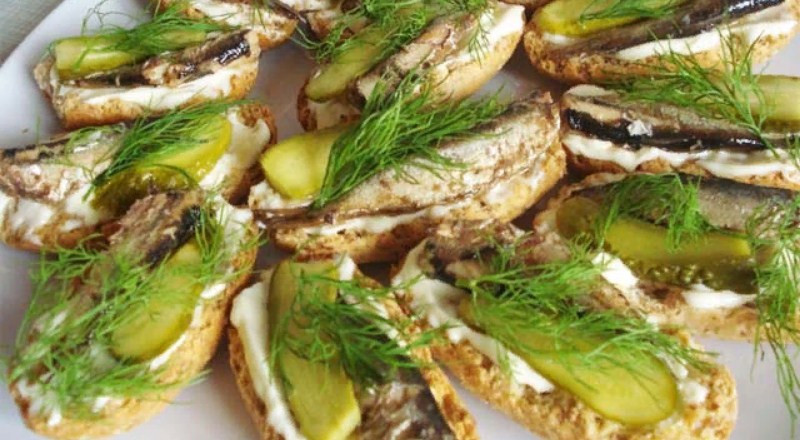 Итак, начнем пожалуй с самого простого варианта — со шпротами. Эту консерву любят практически все и на новогоднем столе она всегда актуальна. Эта рыба отлично сочетается и с маринованными и со свежими огурцами, с помидорами и чесноком. У Вас 100% есть беспроигрышный вариант такого бутерброда, проверенный годами. Однако,всегда хочется попробовать что-нибудь новенькое, поэтому предлагаю несколько вариаций, которые, возможно, Вы еще не готовили.С чесноком и вареным яйцом