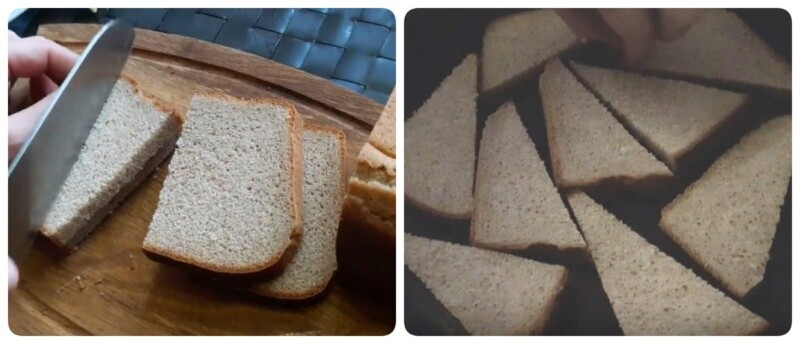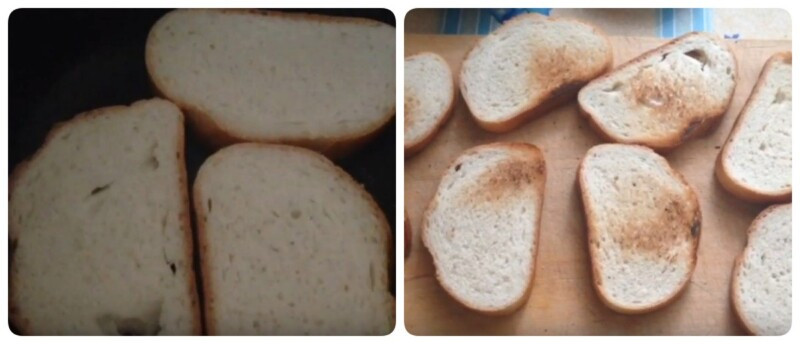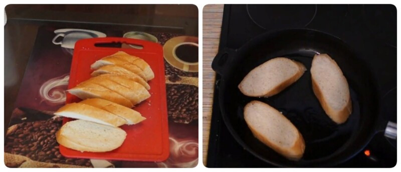 1. Хлеб нарезаем на ломтики и отправляем подсушиться на сковороде. Масло не добавляем, поджариваем с двух сторон.
