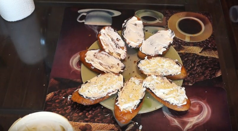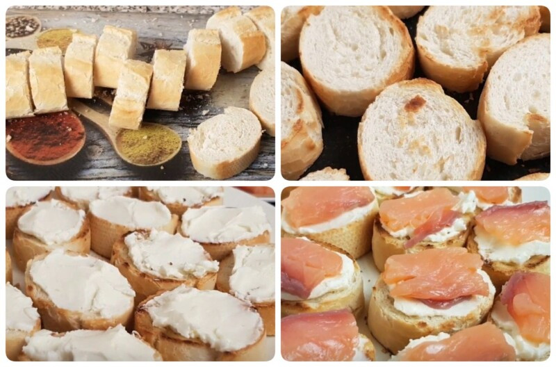 1. Багет нужно будет нарезать на ломтики одинакового размера и подсушить с двух сторон на сковороде без масла. Потом покрываем поверхность каждого кусочка творожным сыром и кладем кусочек рыбы.