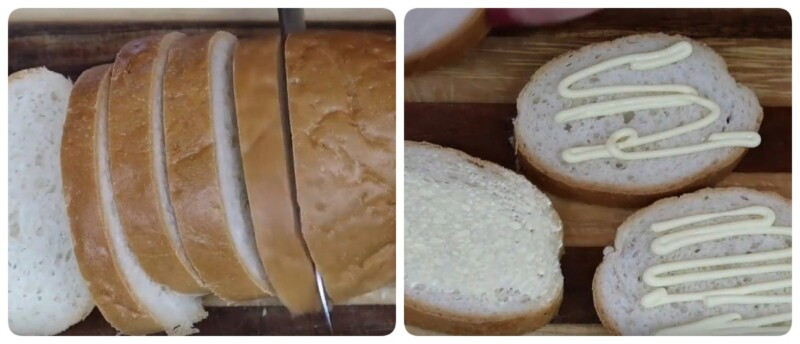 1. Берем самый свежий батон и начинаем его нарезать. Делайте кусочки среднего размера. Потом майонезом хорошо промазываем каждый ломтик, чтобы закуска была сочная.