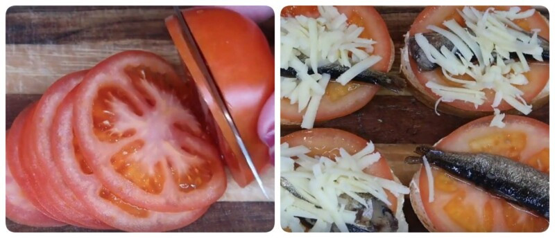 2. Помидор нарезаем на тонкие кольца и выкладываем на хлеб. Следом кладем рыбу и все посыпаем тертым сыром. Ломтики помещаем на противень и отправляем в духовку разогретую до 180 °С на 10 минут.