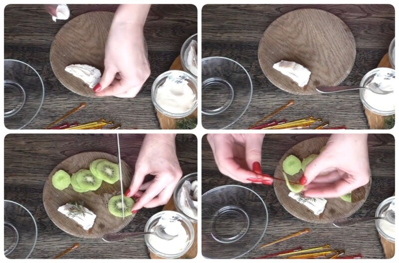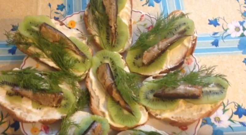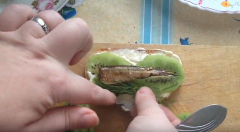3. Теперь соединяем все ингредиенты: хлеб смазываем майонезом с чесноком, сверху кладем несколько ломтиков киви, затем шпротина и веточка укропа.