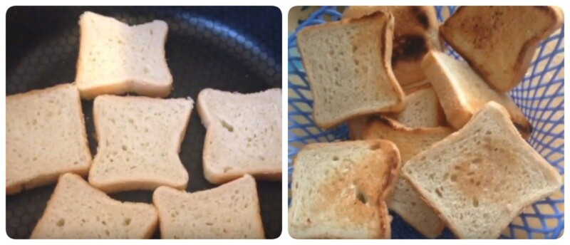 1. Хлеб режем на квадратики средней толщины. Потом выкладываем их на разогретую, сухую сковородку и подсушиваем с двух сторон. Затем даем остыть.