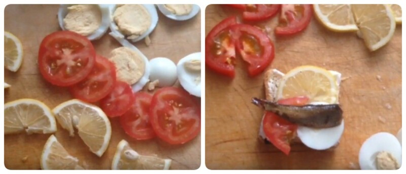 2. Яйца и помидоры нарезаем на кружочки, а лимон на дольки. Теперь можно собирать готовый бутерброд: тост смазываем майонезом, сверху выкладываем нарезанные ингредиенты и последним слоем шпроты.