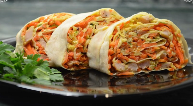 Продолжаем нашу тему новогодних бутеров и плавно переходим к рецептам из лаваша. Блюдо в таком виде тоже очень распространено на всех праздничных столах. Лаваш есть отличная альтернатива хлебу — в него можно завернуть абсолютно любую начинку. Давайте же начнем!С корейской морковкой и ветчиной