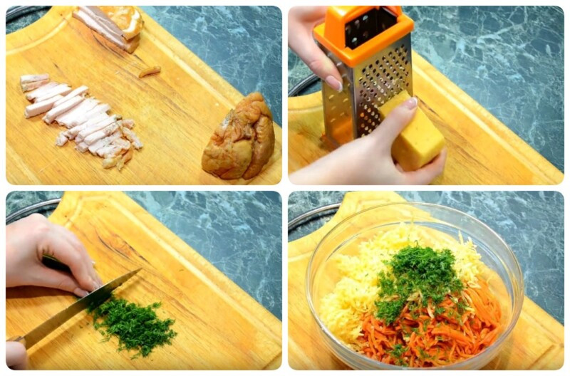 1. Начнем с подготовки ингредиентов. Ветчину нарезаем не длинной соломкой, натираем сыр на крупной терке (можно и на мелкой), измельчаем укроп. Затем в миске смешиваем все нарезанные компоненты и добавляем морковку по-корейски. Все тщательно перемешиваем.