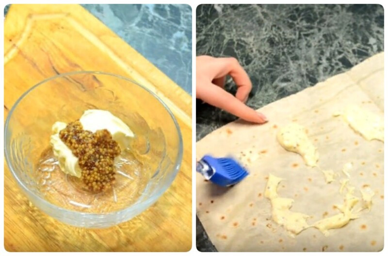 2. Начинку отставляем пока в сторону и занимаемся подготовкой лаваша. Для этого готовим смесь из майонеза и зерновой горчицы. Смазываем ей весь лист лаваша.