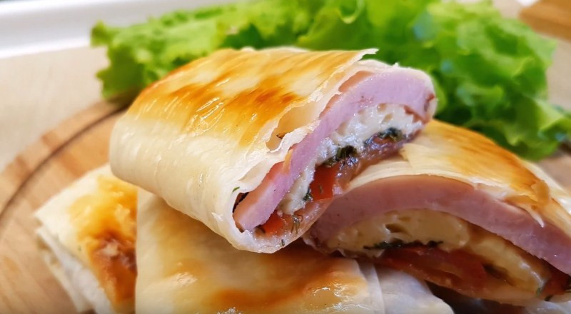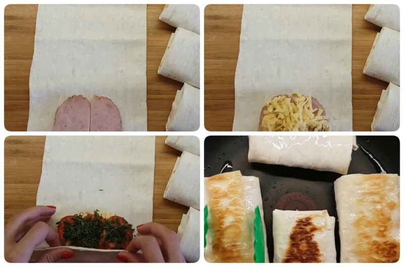 2. Так, теперь можно начать формировать наши горячие бутерброды. Сначала нужно лист лаваша разрезать на ленточки шириной примерно 20 см. Теперь укладываем слоями сначала ветчину, затем сыр, несколько колец помидора, потом зелень и сверху все солим. Далее сворачиваем как шаурму и обжариваем на сковороде с двух сторон до золотистой корочки.