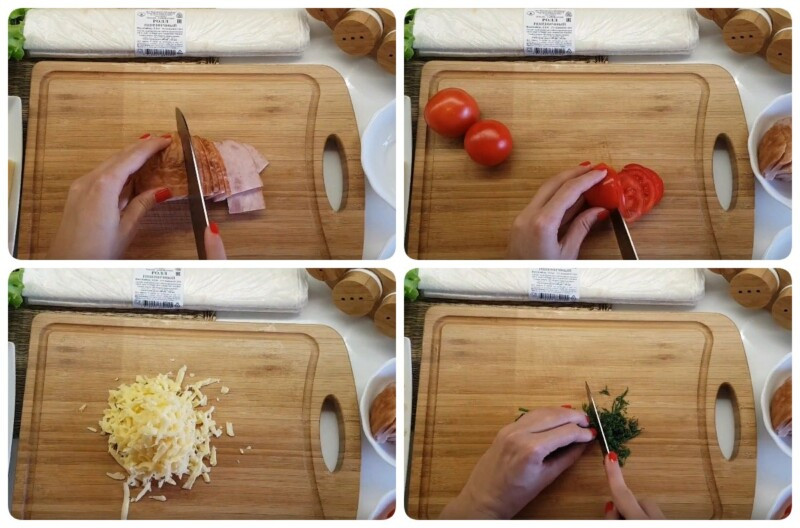 1. Сначала давайте все нарежем и натрем. Ветчину режем на слайсы, а помидоры — на кружочки. Сыр трем на крупной терке, укроп мелко шинкуем.