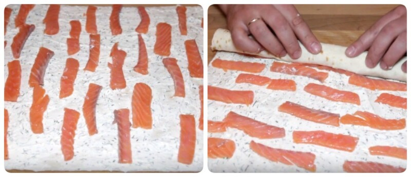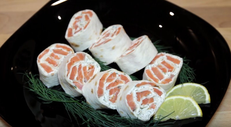 3. Нарезанную рыбку выкладываем равномерно по всей площади лаваша и сворачиваем плотно рулетом. Готовый ролл отправляем на 1 час в холодильник.