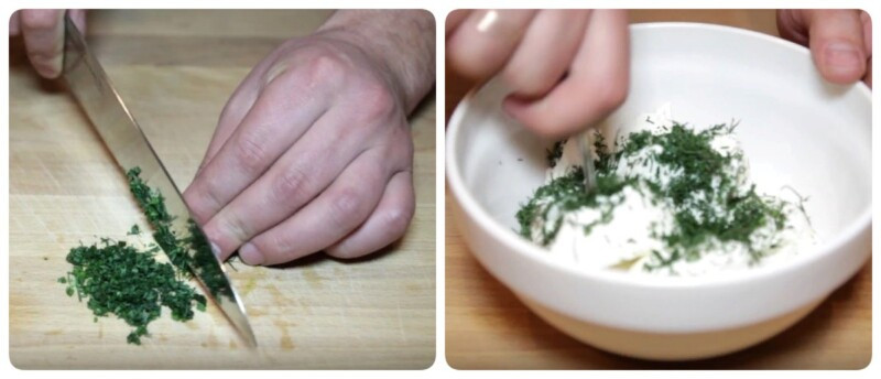 1. Первым делом давайте смешаем мелко нарезанный укроп и творожный сыр. Туда же выдавливаем примерно 1 ч. л. лимонного сока и все тщательно перемешиваем.