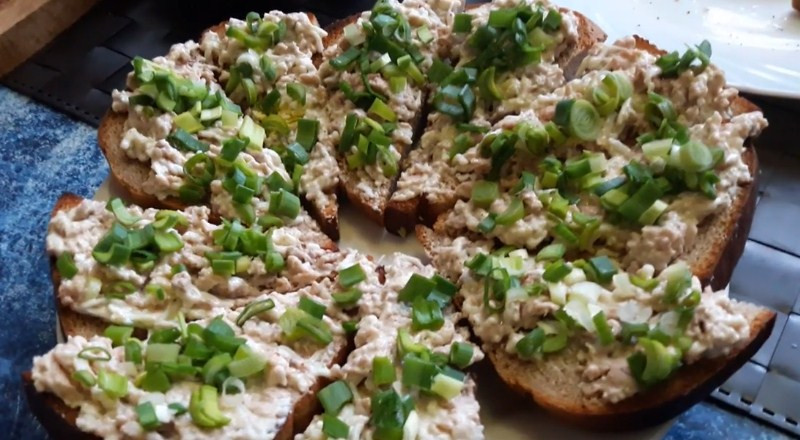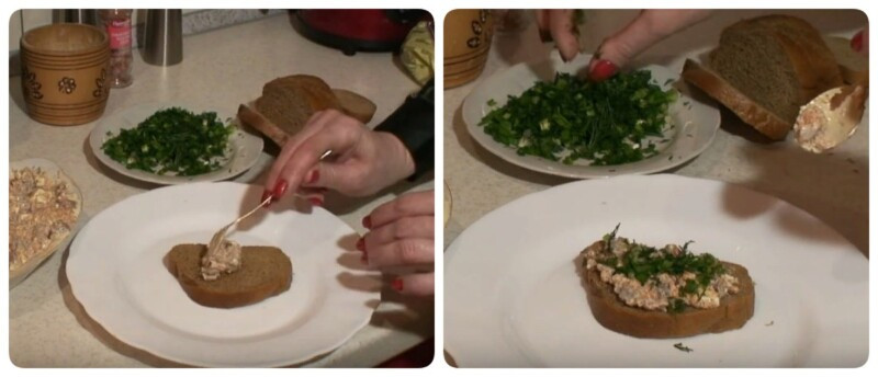 2. Хлеб нарезаем на кусочки и смазываем получившейся помазкой. Сверху присыпаем зеленью и все готово.