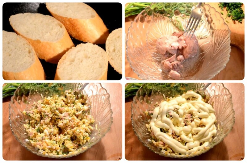 2. Когда ломтики стали румяными, снимаем их с огня и даем немного остыть. Когда прошло несколько минут берем зубчик чеснока и хорошо натираем хлеб (можно со всех сторон). Далее мажем майонез и насыпаем протертые через мелкую терку отварные яйца.