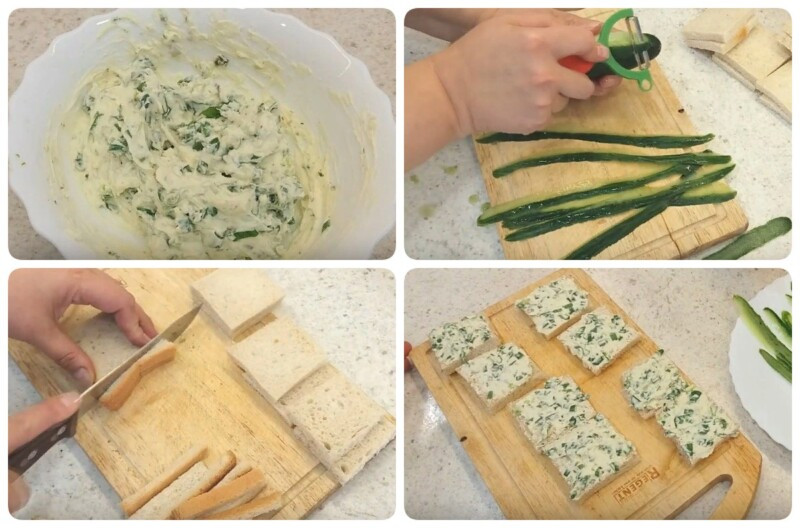 1. Сначала сделаем помазку для сэндвичей. Для этого необходимо просто смешать сливочный сыр и зеленый лук. Далее подготовим остальные ингредиенты: с огурца аккуратно снимаем кожицу (лучше всего это делать при помощи картофелечистки), с хлеба срезаем корочки. После чего смазываем смесью сыра и лука наши ломтики.