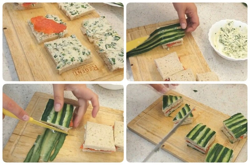 2. Сверху на смазанный кусочек кладем красную рыбу и накрываем сверху вторым ломтиком хлеба. Теперь закрытый сэндвич мажем помазкой сверху и выкладываем полоски кожицы огурца. Лишнее срезаем и то же самое проделываем с другой стороной бутерброда.