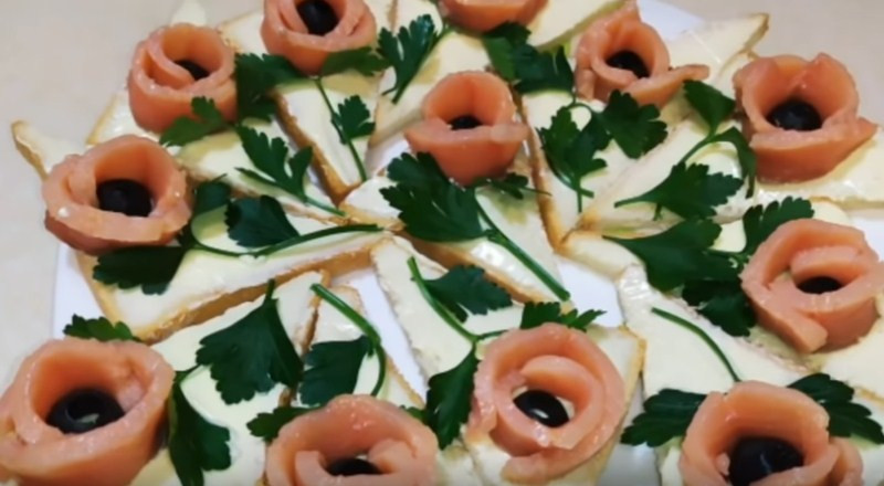 2. Давайте приступим к изготовлению маков. С одного края хлеба кладем кусочек маслины, а вокруг делаем лепестки из красной рыбы. Их выкладываем по кругу.