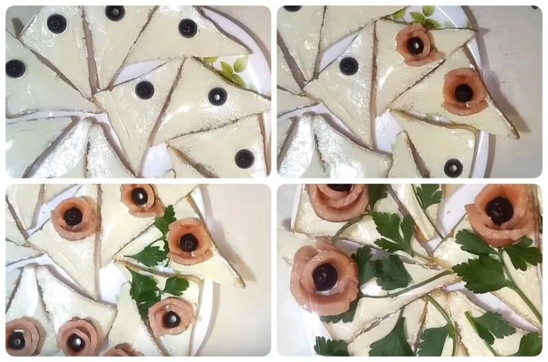 Перед тем, как ставить закуску на стол разрежьте ее наискось, чтобы получились треугольники. Теперь красиво выкладываем и кушаем с удовольствием.
