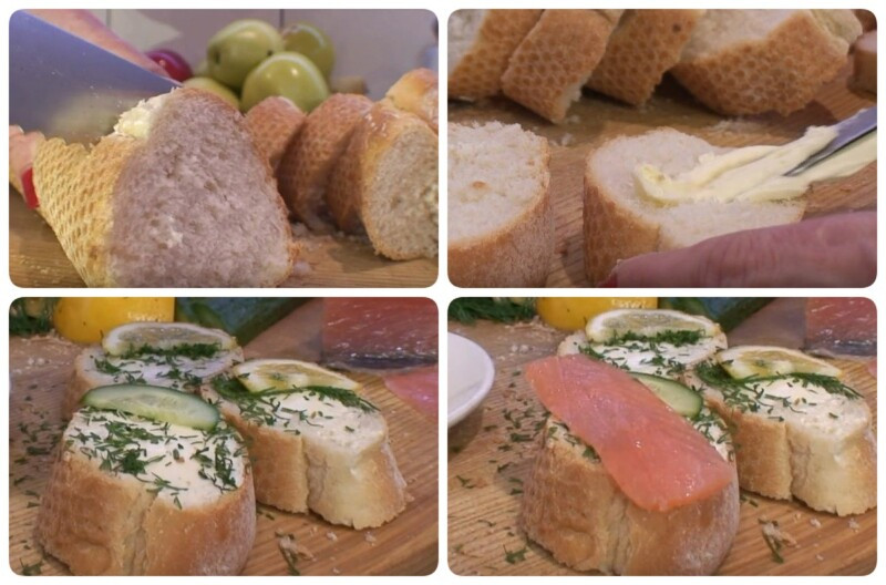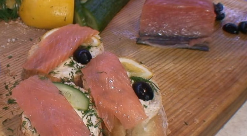 1. Багет нарезаем на одинаковые ломтики и смазываем мягким сливочным маслом. Сверху посыпаем нарезанным укропом. Затем выкладываем кусочки лимона и огурца. Заключительным слоем кладем рыбку.