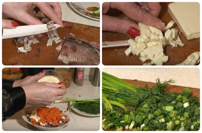 1. Сельдь пластуем и нарезаем на мелкие кубики. Точно также нарезаем и плавленный сырок. Все помещаем в общую тару, туда натираем на мелкую терку морковь, добавляем майонез и тщательно перемешиваем. Затем нужно будет нарезать зелень, она пригодится нам немного позже.