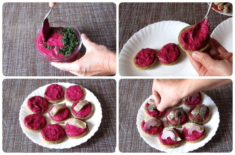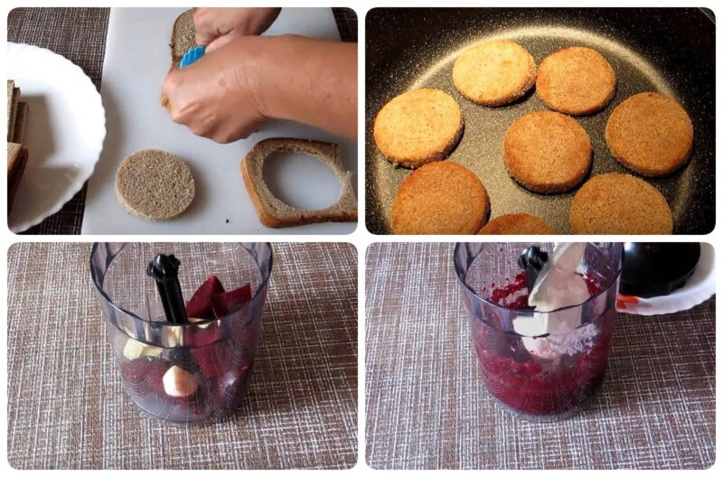 1. Черный хлеб режем на кусочки, затем из мякоти вырезаем кружочки. Их потом нужно будет обжарить на подсолнечном масле с двух сторон до хрустящей корочки. Пока гренки остывают займемся свекольной подушкой: буряк надо отварить, почистить, добавить к нему чеснок и перебить в блендере. Затем добавить плавленный сыр и еще раз хорошо перемешать.