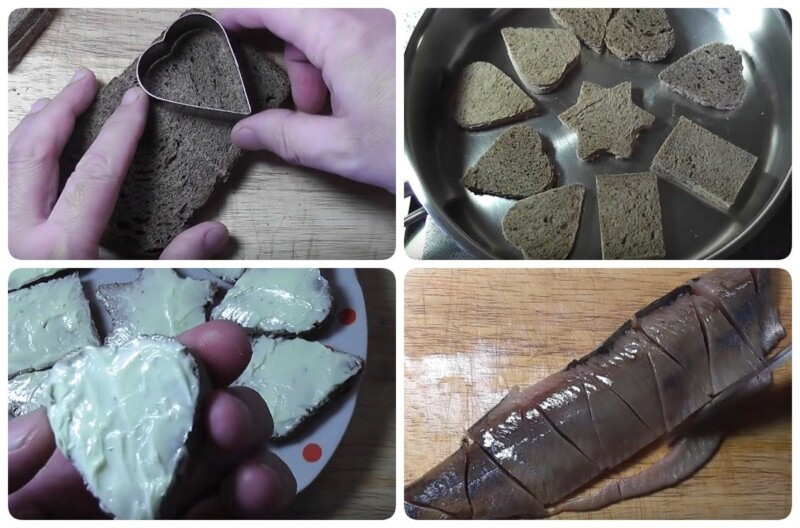 1. При помощи формочек для выпечки вырезаем мякоть хлеба (можно вырезать вручную). Потом кусочки нужно слегка подсушить на сухой сковороде. Филе селедки нарезаем треугольниками, а гренки смазываем сначала тонким слоем сливочного масла, потом сыром.