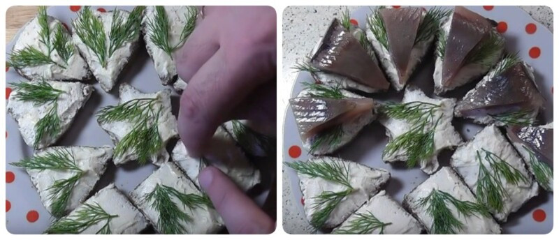 2. Начинаем подготавливать закуску к подаче: на хлеб выкладываем веточки укропа, потом кусочки рыбы.