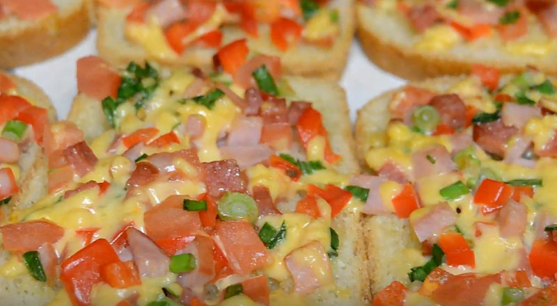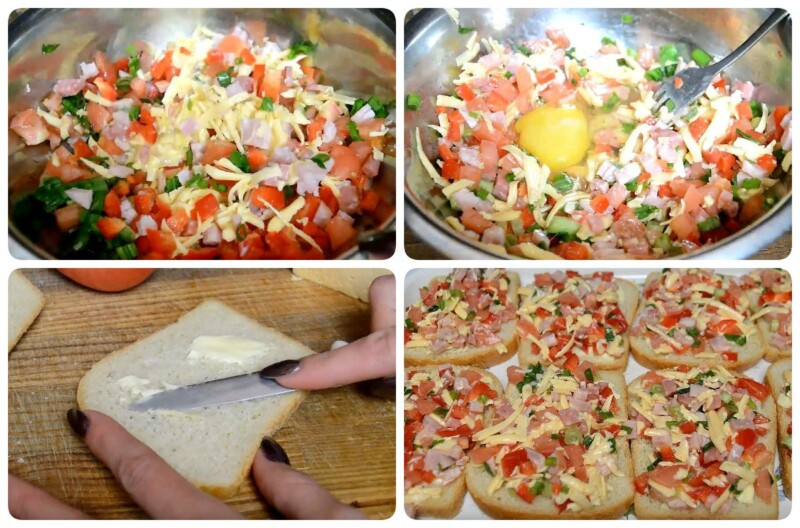 1. Колбасу, томат и перец режем на кубики, лук мелко шинкуем, а сыр натираем на терке. К этим ингредиентам добавляем яйцо, щепотку соли и хорошо перемешиваем. Далее мажем хлеб сливочным маслом и выкладываем сверху нашу начинку. Ставим все в духовку минут на 15. О готовности будет свидетельствовать хорошо расплавленный сыр.