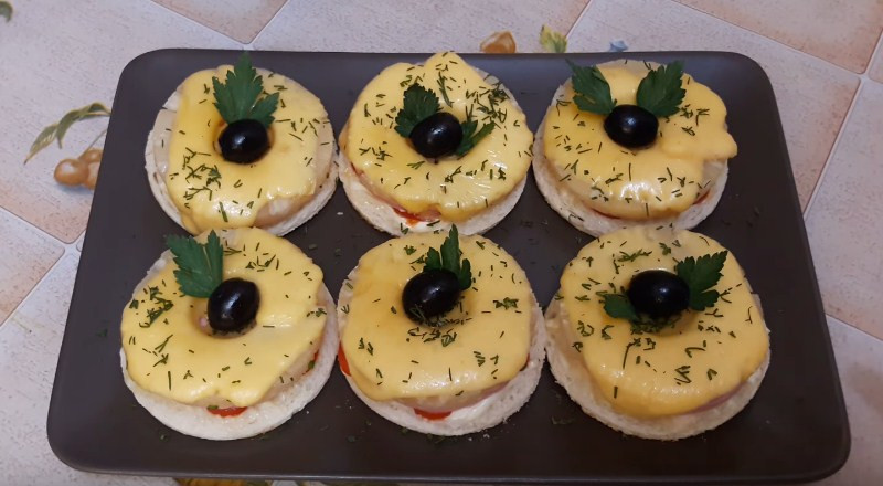 Украшаем каждый бутерброд маслинами и скорее подаем гостям. Приятного аппетита!