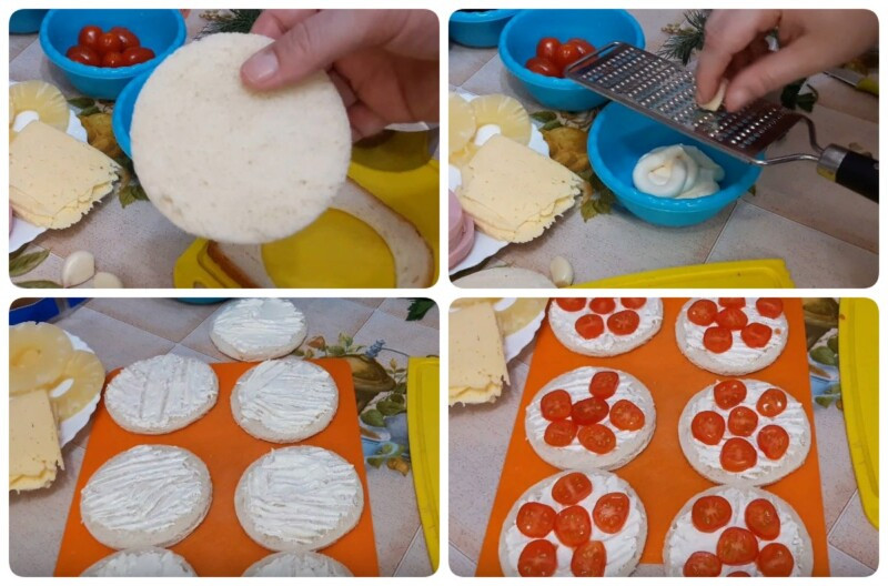 1. Из хлеба вырезаем шайбы. Их нужно смазать смесью майонеза и чеснока. Затем можно начать выкладывать помидоры.