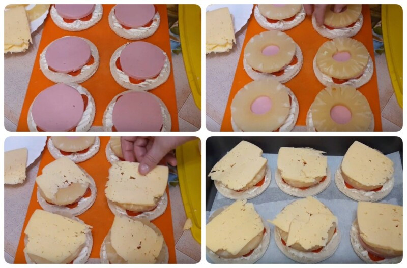 2. Продолжаем выкладывать слои и следующим будет колбаса, за ней кружочки ананаса и сыр. Теперь ставим эту красоту на 10 минут в духовку разогретую до 180 °С.