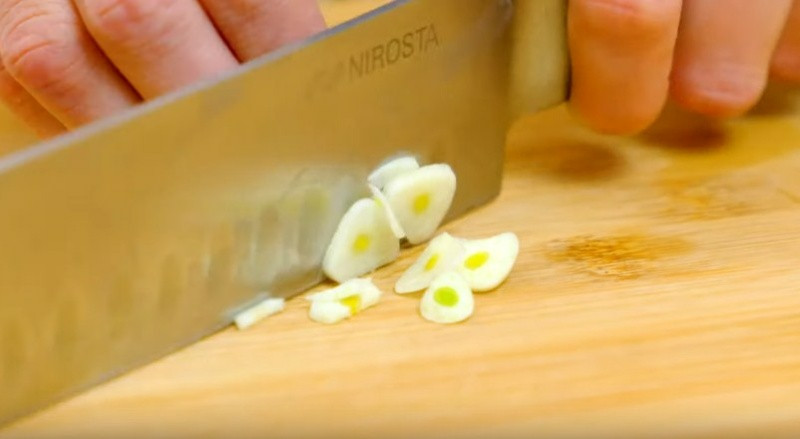 2. Теперь нарежьте чеснок на тонкие пластинки. Если вы не очень любите чеснок, то уменьшите его количество.