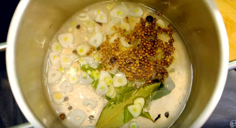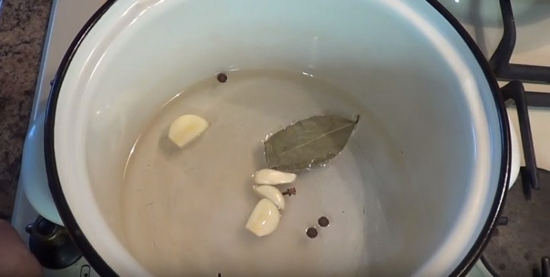 3. Теперь нужно закипятить воду и отправить туда лавровый лист, гвоздику, черный и душистый перец, чеснок, кориандр, соль и сахар.
