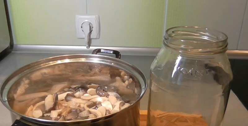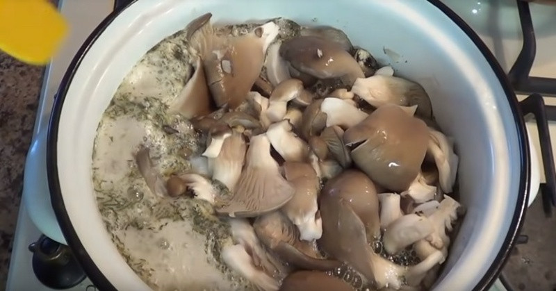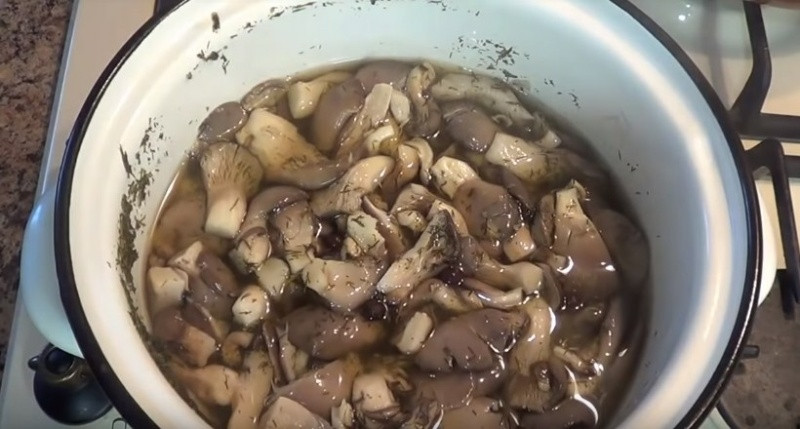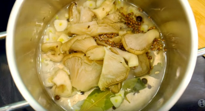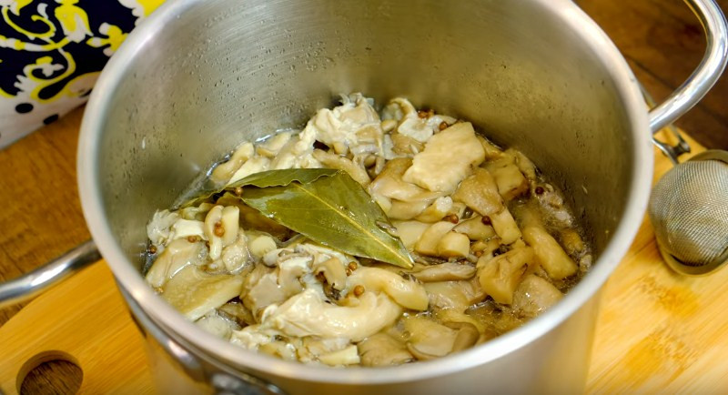 4. После того как маринад закипел, отправляем в кастрюлю отваренные вешенки. Теперь оставляем емкость на медленном огне на 20 минут. Если грибы стали мягкими и душистыми, то самое время снимать с огня.