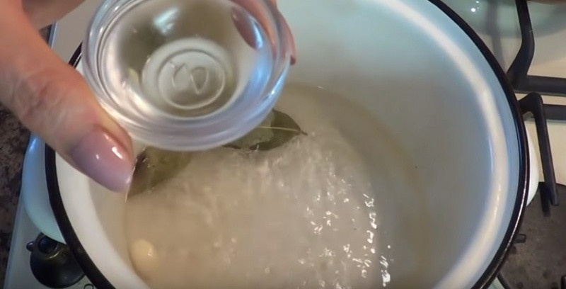 3. Когда рассол закипел вливаем 30 г столового уксуса. В этот момент попробуйте бульон, чтобы понять чего не хватает. Можно добавить немного кислинки за счет уксуса или пряности, кинув еще один цветок гвоздики.