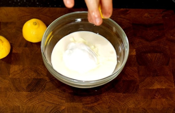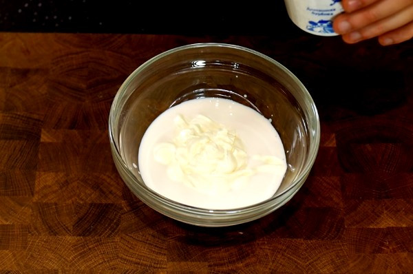 1. В тару, где будем смешивать ингредиенты выливаем ряженку, к ней добавляем сметану и майонез.
