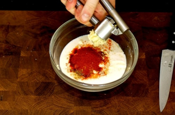 3. Теперь в блюдце высыпаем все специи и выдавливаем чеснок. Перемешиваем.