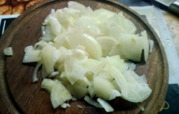 2. Теперь нарезаем лук на небольшие фрагменты. Я просто накрошил четверть кольцами. Здесь заморачиваться не надо, потому что всё равно продукты будут перебиваться.
