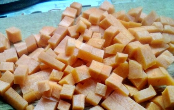 3. Морковь нарезаем средним кубиком. Можно также натереть на крупной тёрке, но так при жарке она потеряет весь сок.