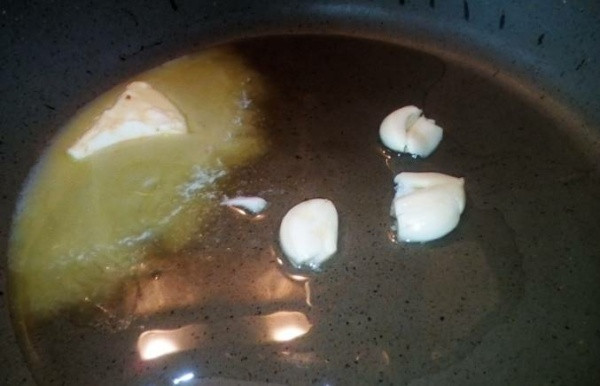 4. Ставим на плиту сковороду и наливаем в неё немного растительного масла. Я даже кинул чу-чуть сливочного (30 г). Берём чеснок, очищаем и раздавливаем на доске плоской стороной ножа. Затем отправляем его на сковороду и обжариваем на протяжении 1-1,5 минуты.