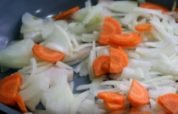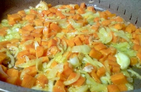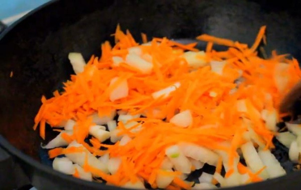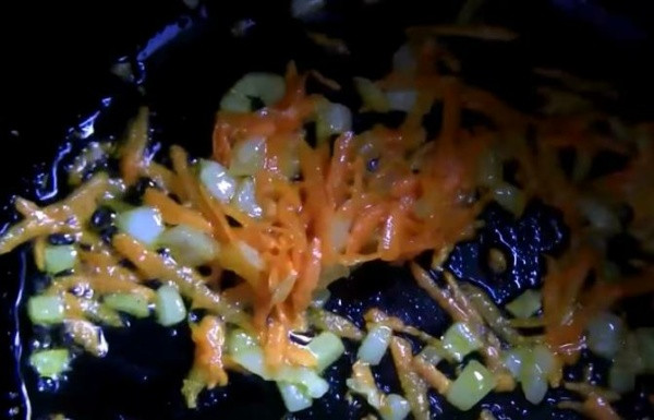 5. Следом, к чесноку закладываем лук с морковь. Теперь овощи необходимо пассеровать до полуготовности. Чтобы было понятнее, попробуйте морковь, она должна быть мягковатая.