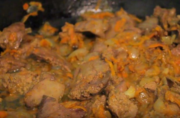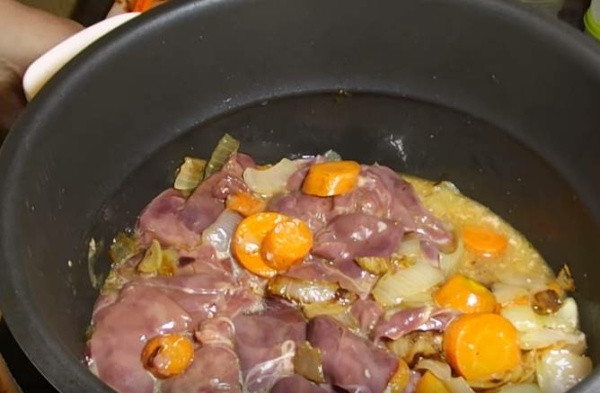 6. Наступило время печени, отправляем её к овощам и сразу перемешиваем. Обжариваем при открытой крышке на протяжении 2-х минут. Вы сможете увидеть, как она начнёт менять цвет. Потом закрываем крышкой и тушим в таком виде где-то 7-10 минут, периодически помешивая.