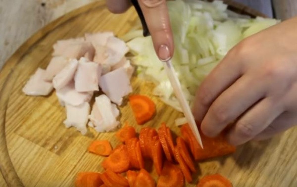 1. Лук и морковь очищаем. Затем овощи нарезаем полукольцами. Сало необходимо нарезать не очень тонкими ломтиками.
