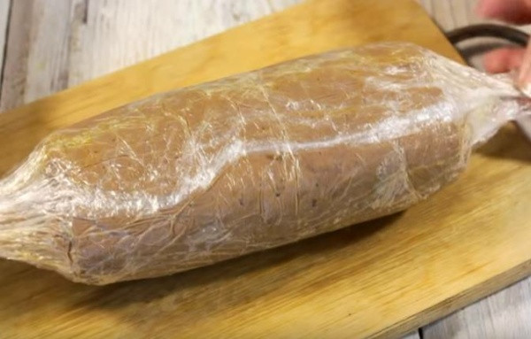 5. Берём пищевую пленку и расстилаем на столе, затем выкладываем на неё готовую массу. Заворачиваем всё придавая форму колбаски. Затем убираем закуску в холодильник на 30-60 минут, чтобы она подзастыла.