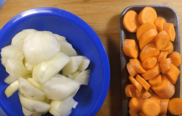 1. Лук и морковь очищаем от кожуры, а затем нарезаем на крупные фрагменты. Обязательно из овощей вырезайте все места где есть гниловатость, иначе это ни к чему хорошему не приведёт.