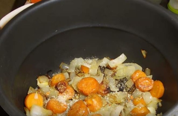 2. В чашу мультиварки наливаем растительное масло. Выставляем на ней режим «выпечка» и отправляем туда овощи. Их необходимо пассеровать на протяжении 15-20 минут. В конце приготовления посолите и поперчите пассеровку.