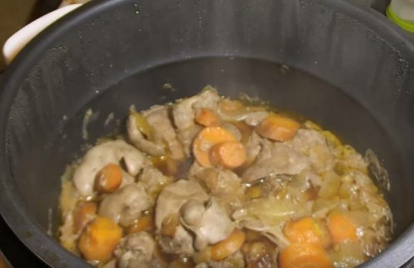3. Печень промываем, сцеживаем от воды и отправляем к овощам. Наливаем мультистакан воды, всё хорошо перемешиваем и закрываем крышку мультиварки. Нам необходимо протушить блюдо, для этого выставляем режим «тушение», если можно выбирать тип продукта – выбираем «мясо». Тушим на протяжении 30 минут.