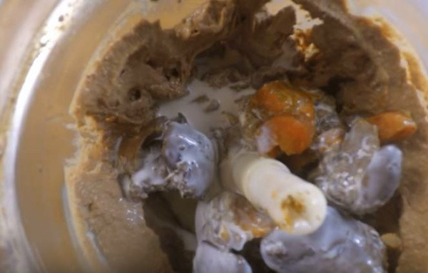 3. Когда заготовка приготовилась, даём ей немного остыть. Затем перекладываем в блендер и перебиваем до однородной массы. Пробивайте тщательно, чтобы в массе не оставалось даже минимальных комочков.