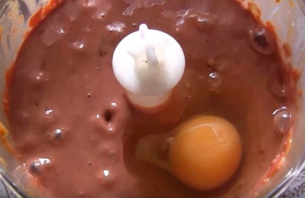 2. Печень заранее промываем, удаляем из неё все прожилки и перекладываем в блендер. Туд же перекладываем готовые овощи. Перемалываем содержимое чаши, а после вносим одно яйцо, мускатный орех, соль, перец и снова всё взбиваем. В этот момент можно уже включить разогреваться духовку.