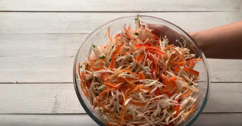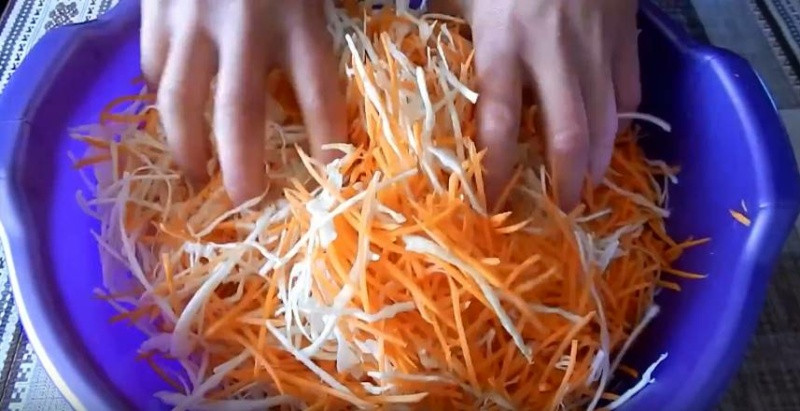 3. Начинаем перемешивать наши овощи. Делаем это легкими движениями ничего не приминая. Нам необходимо лишь смешать капусту с морковью. Добиваться того, чтобы овощи пустили сок не нужно. При желании можете для этих целей воспользоваться двумя вилками.